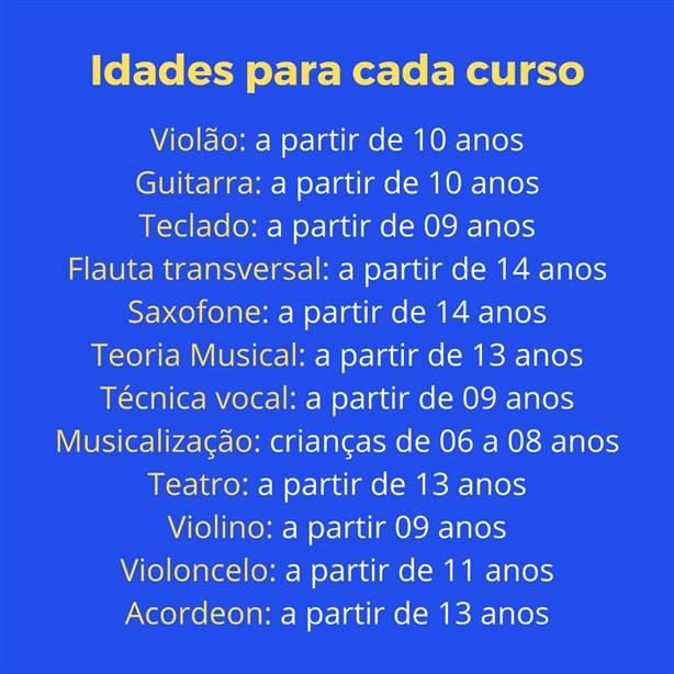 19/05: matrículas para saxofone, flauta transversal (ambos a partir dos 14 anos) e teoria musical (a partir dos 13 anos);