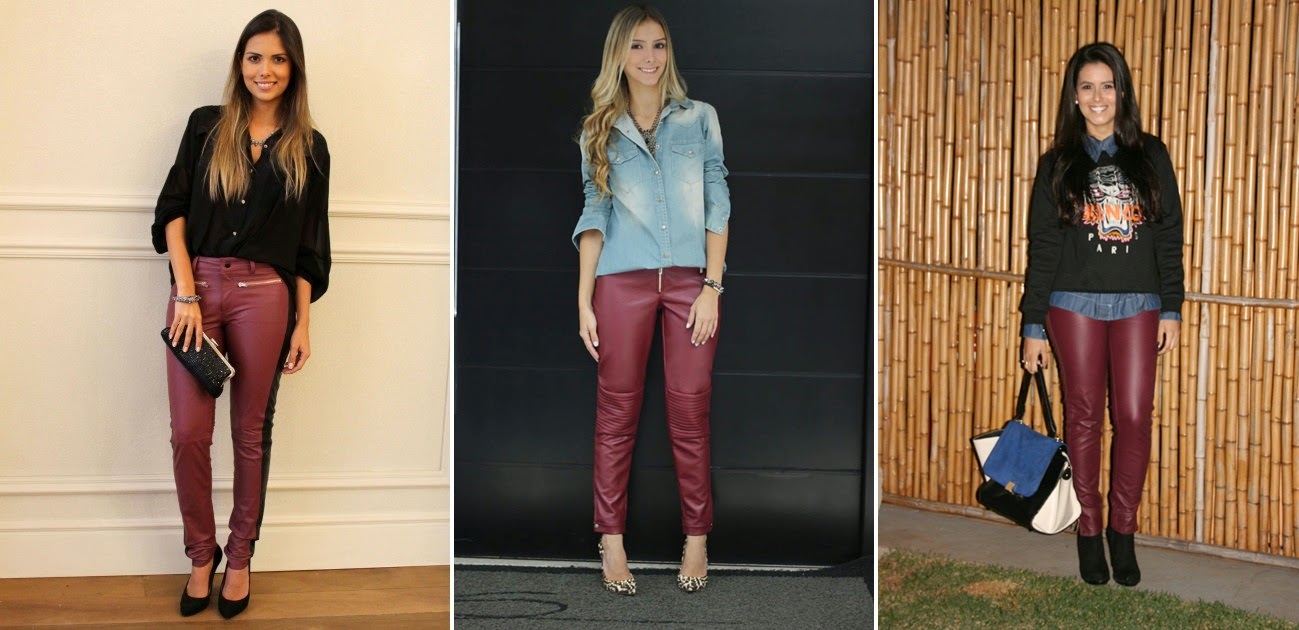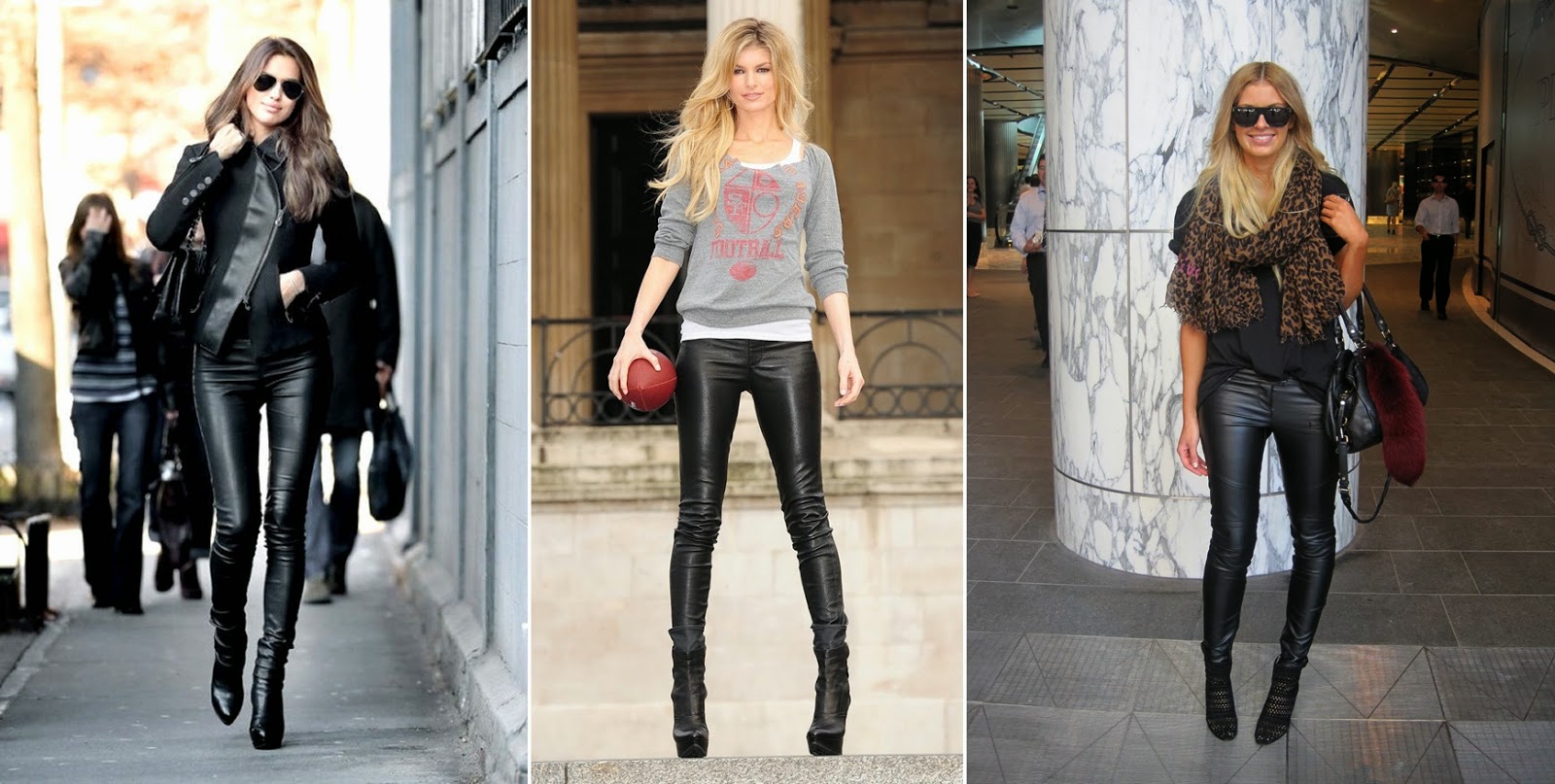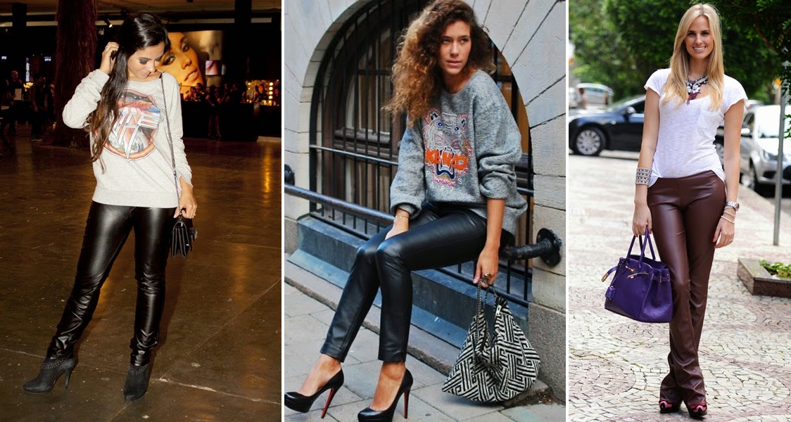 Hoje vou falar de uma tendência de inverno que eu AMO: o couro. Antigamente o couro era bastante usado por motoqueiros e roqueiros e havia até um certo preconceito quanto a esse tecido, mas hoje em dia está bem popularizado e muitas marcas produzem o chamado couro fake. Eu acho o tecido mais invernal impossível, ao mesmo tempo que consegue passar elegância o couro também da um ar mais cool as produções. Hoje em específico vou falar sobre as calças. Eu sempre ouço as mesmas brincadeirinhas quando uso essa peça vai de moto? e aí fantasia de mulher gato? mas já acostumei e nem ligo mais, só concordo se a gente for ligar pras piadinhas acaba não usando nada do que gosta. A calça de couro por si só já é sexy, mas aquele sexy sem ser vulgar que a gente adora, sabe? Os modelos não variam muito: skinny ou flare, que são os clássicos da moda. Quem optar pelo modelo skinny uma boa dica para alongar a silhueta é usar uma botinha de couro na mesma cor. Outra dica importante é contrabalancear o look, ou seja, se escolher a skinny use peças mais soltinhas em cima: moletons, tricôs, blusas. Agora, quem optar o modelo flare pode usar peças mais acinturas na parte de cima: blazers, camisas. Vale combinar a calça de couro com outras peças mais alegres, estampadas, outras texturas e ficam muito bem com t-shirts. Use o bom senso e só leve pra casa se a calça realmente vestir bem, caso contrário ela pode detonar o seu look. As calças de couro existem em diversas cores, mas a minha favorita continua sendo a boa e velha pretinha básica, mas as peças na cor burgundy também são lindas. Chega de blablabla né, vamos nos inspirar: