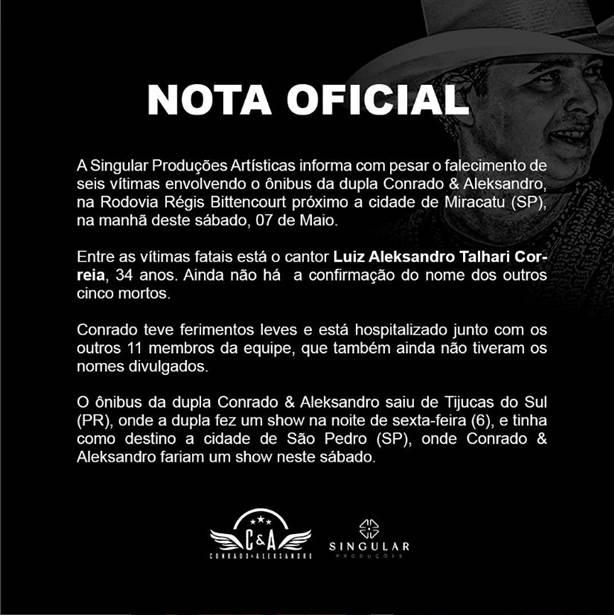 A Singular Produções Artísticas publicou uma nota oficial nas redes sociais de Conrado e Aleksandro e confirmou a morte do cantor Aleksandro, de 34 anos, em acidente na Rodovia Régis Bitencourt, próximo a cidade de Miracatu (SP), neste sábado (7).