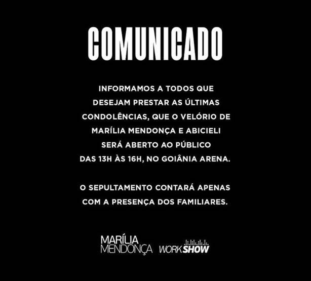 O corpo da cantora Marília Mendonça e do tio Abicieli Silveira Dias serão velados juntos. O sepultamento será fechado e permitido apernas para familiares.