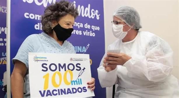 Uma imagem divulgada pela Prefeitura de Londrina marcou a casa dos 100 mil londrinenses vacinados com a primeira dose da vacina contra a Covid-19. As fotos são da Maria Aparecida, de 63 anos, que mora na zona leste do município e foi ao Centro de Imunização da Zona Norte em busca do imunizante. "Fiquei assustada, não esperava que aconteceria tudo isso. Fiquei muito assustada, mas foi muito bom receber a vacina e ainda ser registrada", conta a aposentada.
