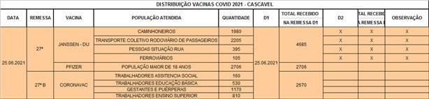 Cascavel receberá 4.685 doses da Janssen, 2.706 da Pfizer e 2.670 da Coronac.
