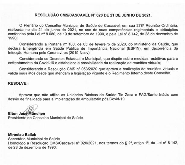 A Secretaria de Saúde havia anunciado a criação de ambulatórios pós-covid em Cascavel nas unidades do do tio Zaca e Santo Inácio. Nesta quinta-feira (221), uma resolução foi homologada informando que as unidades não poderão ser usadas para essa finalidade.