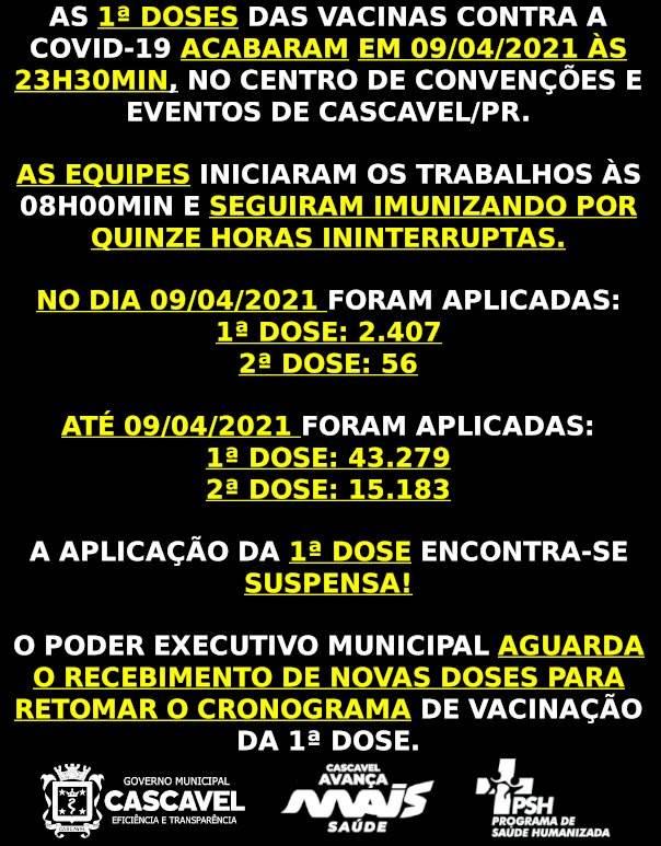 A Secretaria de Saúde informa que esta sexta foi o último dia de aplicação da 1ª dose a vacina contra a Covid-19. A imunização foi suspensa até o recebimento de novas doses por parte do governo federal.