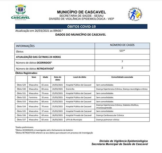 Cascavel registrou nove mortes em decorrência da Covid-19 nos últimos. A cidade tem 28.897 casos positivos da doença.