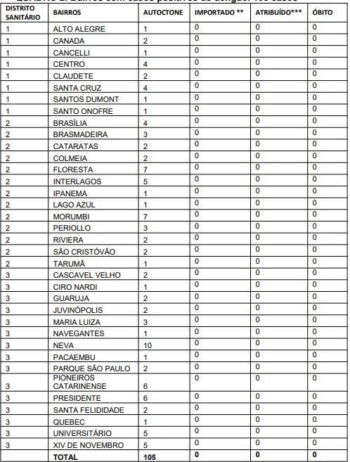 Cascavel tem 105 casos confirmados de dengue, e nenhum registro de zika e chikungunya. Dos exames confirmados, 80 foram através de exame e 25 por critério clinico epidemiológico.