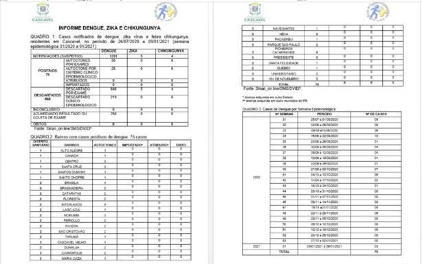 A Secretaria de Saúde divulgou o boletim semanal dos dados das doenças causadas pelo mosquito Aedes aegypti em Cascavel.