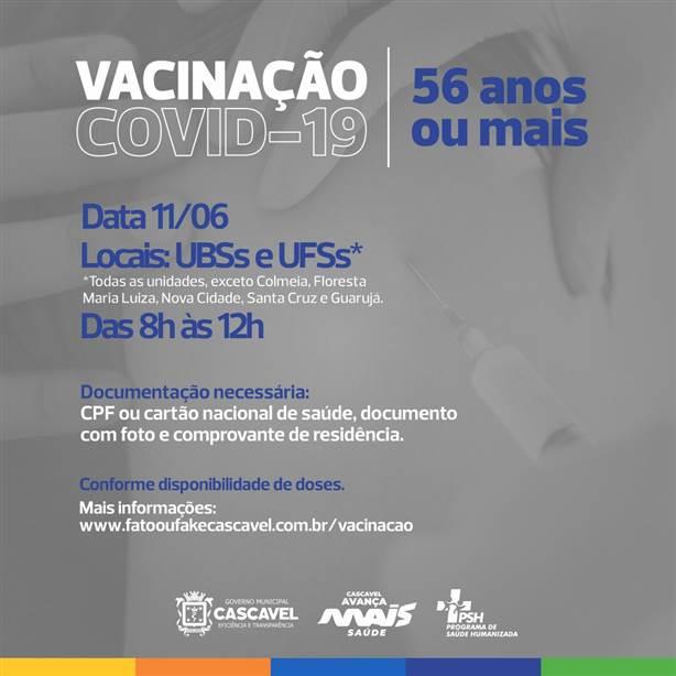 Cascavel vai vacinar pessoas com 56 anos completos ou mais a partir de sexta-feira (11).