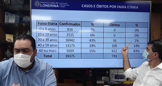 Uma tabela foi apresentada com os casos de coronavírus em Londrina, apontando que 83% dos óbitos são pessoas com mais de 60 anos. Com isso, o chefe do executivo ressaltou a importância da vacinação começar pelos idosos.