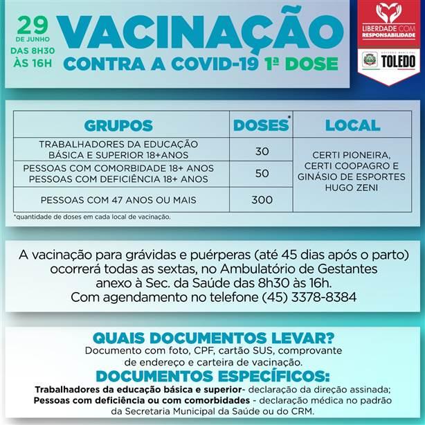 A imunização irá ocorrer das 08h30 às 16h00, nos três pontos já conhecidos, localizados no Ginásio de Esportes Hugo Zeni, na Vila Industrial; no Centro de Revitalização da Terceira Idade Doutor Wilson Carlos Kuhn (Certi), na Vila Pioneiro; e no Certi Ernesto Dall’Oglio, no Jardim Coopagro. Serão 30 doses em cada ponto para trabalhadores da educação básica com 18 anos ou mais; 30 doses em cada ponto para trabalhadores da educação superior com 18 anos ou mais; 50 doses em cada ponto para pessoas com deficiência com 18 anos ou mais; 50 doses em cada ponto para pessoas com comorbidades com 18 anos ou mais; e 300 doses em cada ponto para o público geral com 47 anos ou mais.