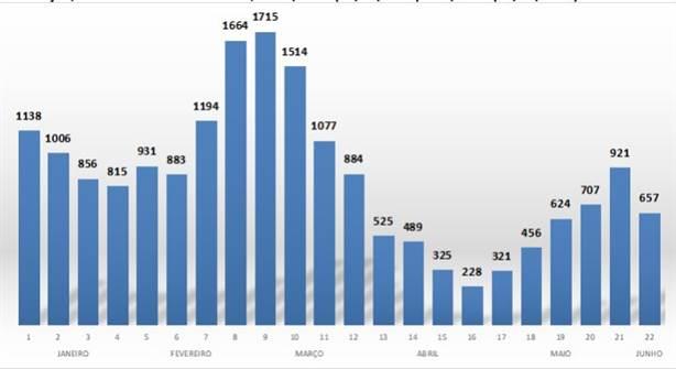 No dia 05 de junho os casos ativos chegaram a 667, correspondendo a 59,66% do nº de casos do maior pico registrado em 03/03/2021.
