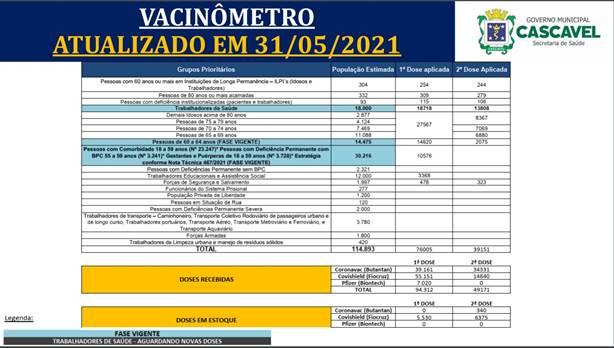 A vacinação contra a Covid-19 continua em Cascavel a todo vapor. Até o momento já foram disponibilizadas vacinas para 100% dos trabalhadores da linha de frente, 100% dos trabalhadores de saúde, independente do setor, dos grupos prioritários de 01 a 08. Além disso, estão sendo disponibilizadas vacinas para 100% dos trabalhadores de saúde, independente do setor, por meio de escalonamento dentro do grupo prioritário n. 09 e n.10 conforme a disponibilidade de doses.