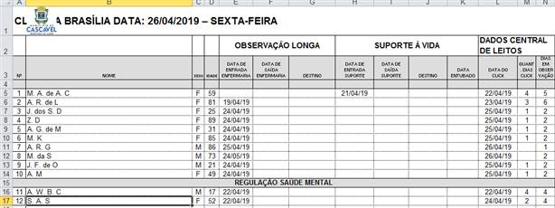 Confira o relatório diário de pacientes aguardando leito nas Upas em Cascavel. Essa é uma prestação de contas realizada pela Administração Municipal através da Secretaria de Saúde de Cascavel. As planilhas contém informações sobre tempo de espera dos pacientes que aguardam leitos em hospitais, além de idade, sexo e destino em caso de transferência ou de alta.