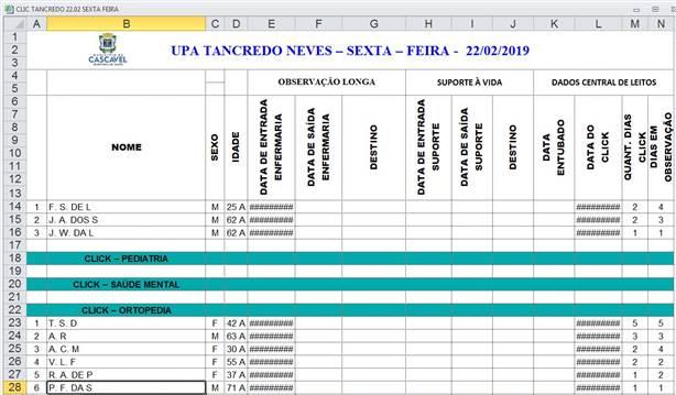 Confira a lista de pacientes aguardando leito nas Upas de Cascavel. Essa é uma prestação de contas realizada pela Administração Municipal através da Secretaria de Saúde de Cascavel. As planilhas contém informações sobre tempo de espera dos pacientes que aguardam leitos em hospitais, além de idade, sexo e destino em caso de transferência ou de alta.
