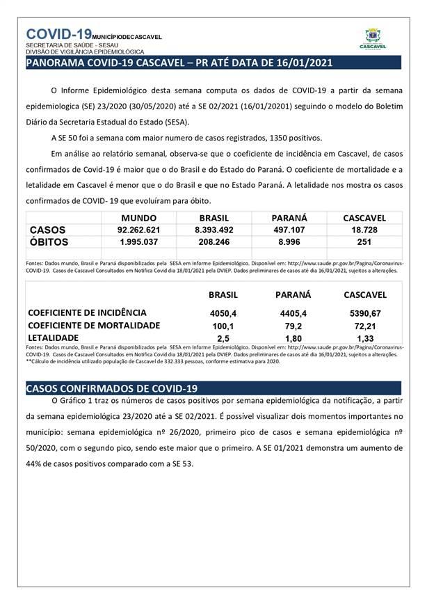 Em análise ao relatório semanal, observa-se que o coeficiente de incidência em Cascavel, de casos confirmados de Covid-19 é maior que o do Brasil e do Estado do Paraná. O coeficiente de mortalidade e a letalidade em Cascavel é menor que o do Brasil e que no Estado Paraná. A letalidade nos mostra os casos confirmados de COVID- 19 que evoluíram para óbito.