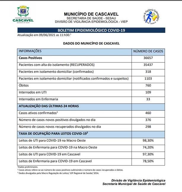 A Prefeitura de Cascavel divulgou na terça-feira (08), o boletim de casos de coronavírus na cidade. Cascavel tem ao todo 36.281 casos positivos, sendo que 35.139 pessoas já se recuperaram da doença. Atualmente 941 pessoas encontram-se em isolamento domiciliar com casos confirmados e suspeitos.