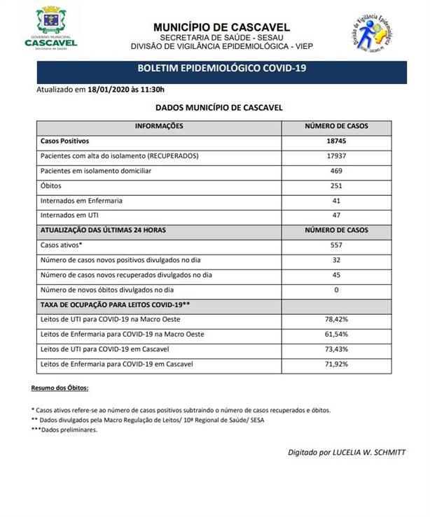 Nesta segunda-feira (18), a Secretaria de Saúde confirmou 18.745 casos de Covid-19 em Cascavel. Dos casos positivos, 17.937 pessoas estão recuperadas.