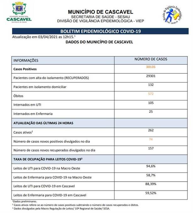 Neste sábado (03), a Secretaria de Saúde de Cascavel divulgou o boletim atualizando os casos de Coronavírus no município. No momento são 30.135 casos positivos, 29.301 pessoas se recuperaram da doença na cidade. Outras 132 pessoas estão em isolamento domiciliar.