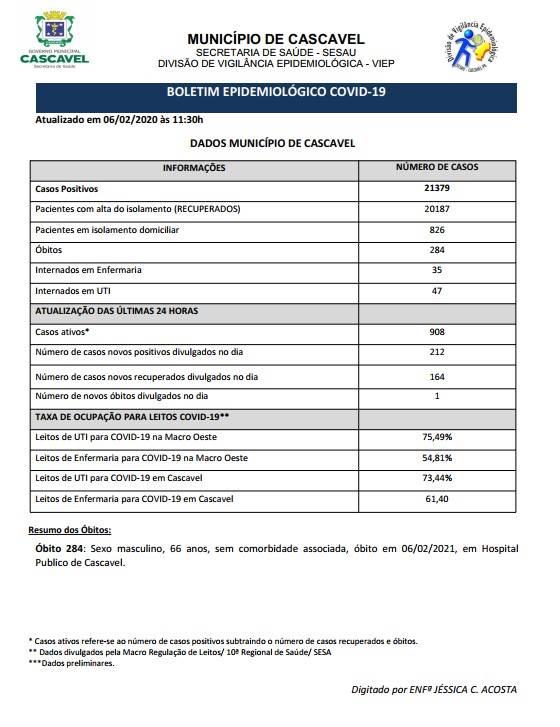Neste sábado (6), a Secretaria de Saúde confirmou 21.379 casos de Covid-19 em Cascavel. Dos casos positivos, 20.187 pessoas estão recuperados. Dos casos confirmados, 826 pacientes permanecem em isolamento domiciliar, 47 estão internados em UTI e 35 em enfermaria. A cidade agora tem 284 mortes.