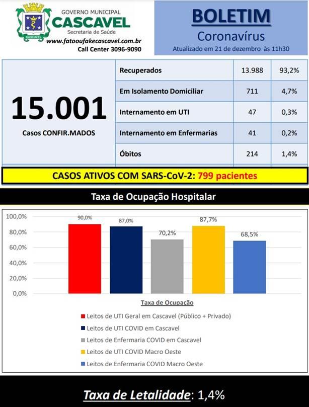 Neste sábado (19), a Secretaria de Saúde confirmou 15.001 casos de Covid-19 em Cascavel. Dos casos positivos, 13.988 pessoas estão recuperadas. Até o momento, 214 óbitos foram confirmados por conta do novo coronavírus no município.