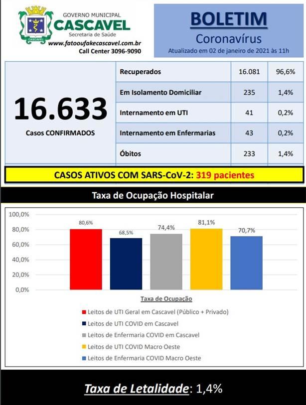 Neste domingo (03), a Secretaria de Saúde confirmou 16.633 casos de Covid-19 em Cascavel. Dos casos positivos, 16.081 pessoas estão recuperadas.