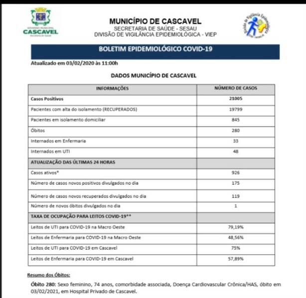 Neste quarta-feira (03), a Secretaria de Saúde confirmou 21.005 casos de Covid-19 em Cascavel. Dos casos positivos, 19.799 pessoas estão recuperados.