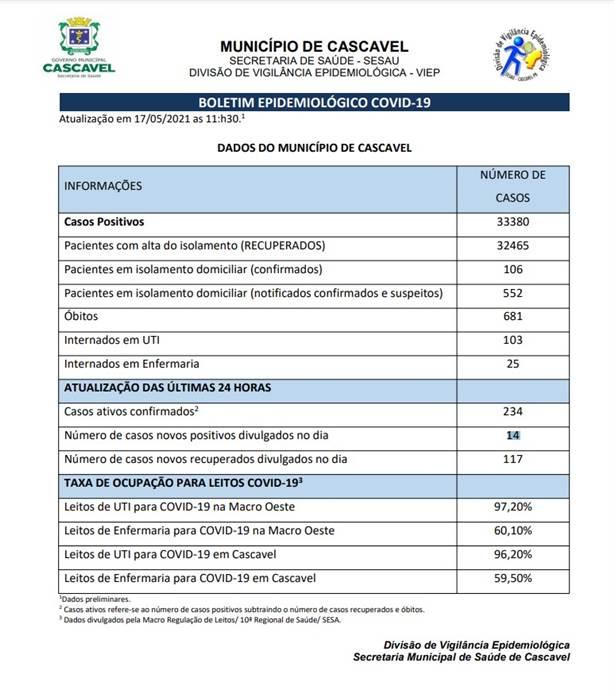 A Prefeitura de Cascavel divulgou nesta segunda-feira (17), o boletim de casos de coronavírus na cidade. Cascavel tem ao todo 33.380 casos positivos, sendo que 32.465 pessoas já se recuperaram da doença. Atualmente 552 pessoas encontram-se em isolamento domiciliar com casos confirmados e suspeitos.
