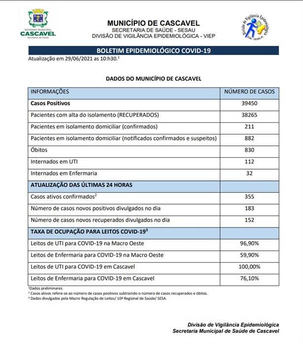 Nas últimas 24 horas foram confirmados 355 casos ativos em Cascavel e 183 novos casos positivos.