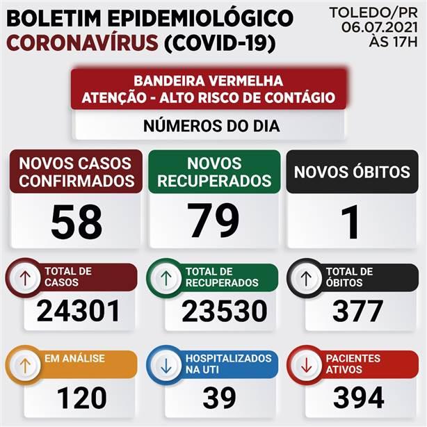 Nesta terça-feira, dia 06/07/2021, tivemos a confirmação de 58 novos casos da COVID-19, em Toledo