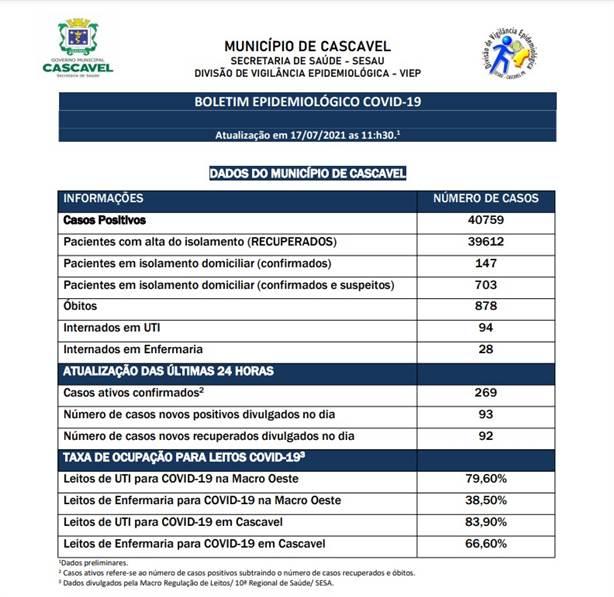 A Prefeitura de Cascavel divulgou neste sábado (17), o boletim de casos de coronavírus na cidade. Cascavel tem ao todo 40.759 casos positivos, sendo que 39.612 pessoas já se recuperaram da doença. Atualmente 703 pessoas encontram-se em isolamento domiciliar com casos confirmados e suspeitos.