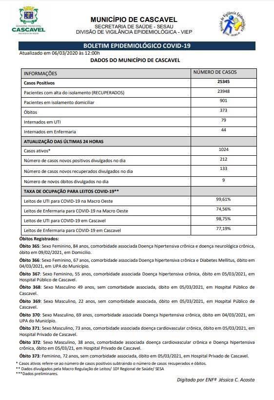 Dos casos confirmados, 901 pacientes permanecem em isolamento domiciliar, 79 estão internados em UTI e 44 em enfermaria. Cascavel soma 373 mortes causadas pela doença, com nove nas últimas 24h.