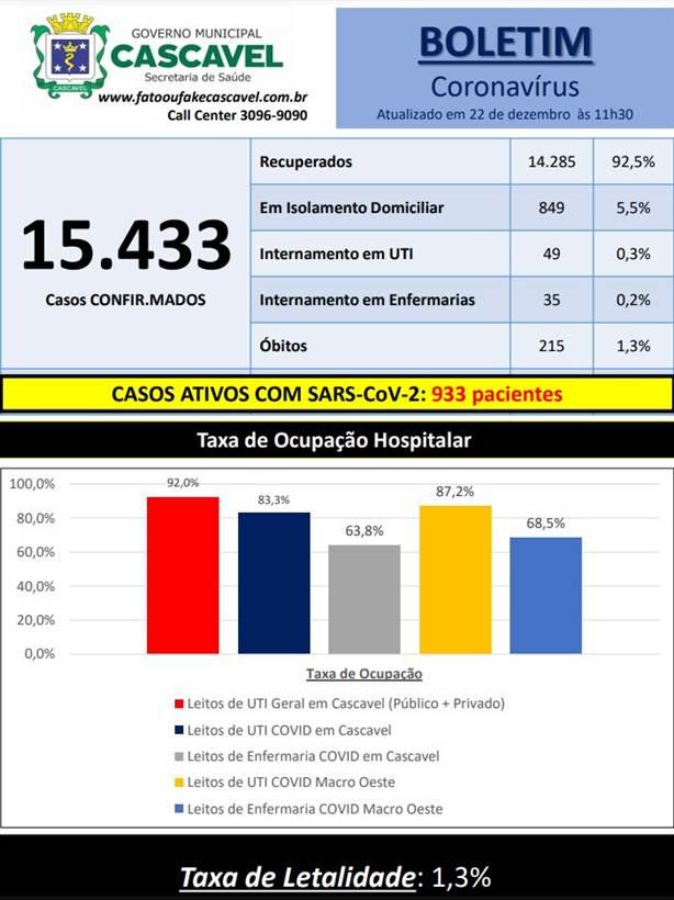 Neste sábado (19), a Secretaria de Saúde confirmou 15.433 casos de Covid-19 em Cascavel. Dos casos positivos, 14.285 pessoas estão recuperadas. Até o momento, 215 óbitos foram confirmados por conta do novo coronavírus no município.