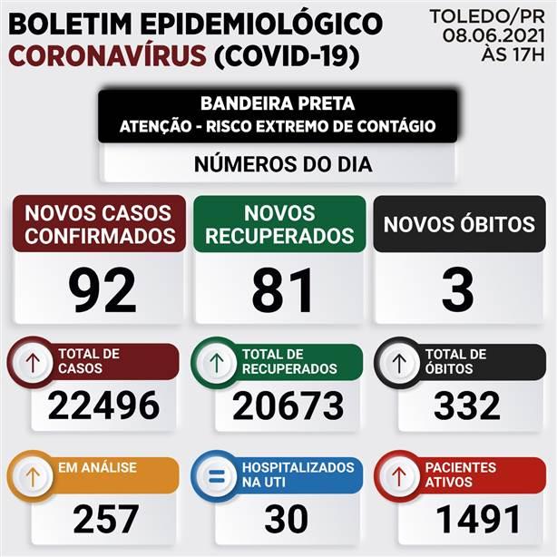 Nesta terça-feira, dia 08, tivemos a confirmação de 92 novos casos da COVID-19, em Toledo.