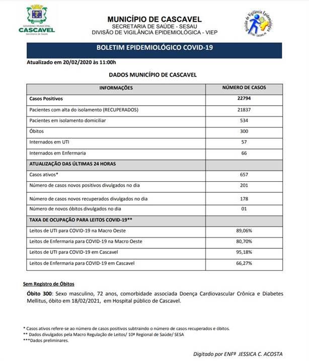 Boletim 20/02/2021: Foz registra 151 novos casos de Coronavírus em 24 horas. A Vigilância Epidemiológica de Foz do Iguaçu confirma na data de hoje, 20/02/2021, 151 casos de COVID-19, totalizando 24.657 casos da doença no município. Deste total, 23.687 pessoas já estão recuperadas.