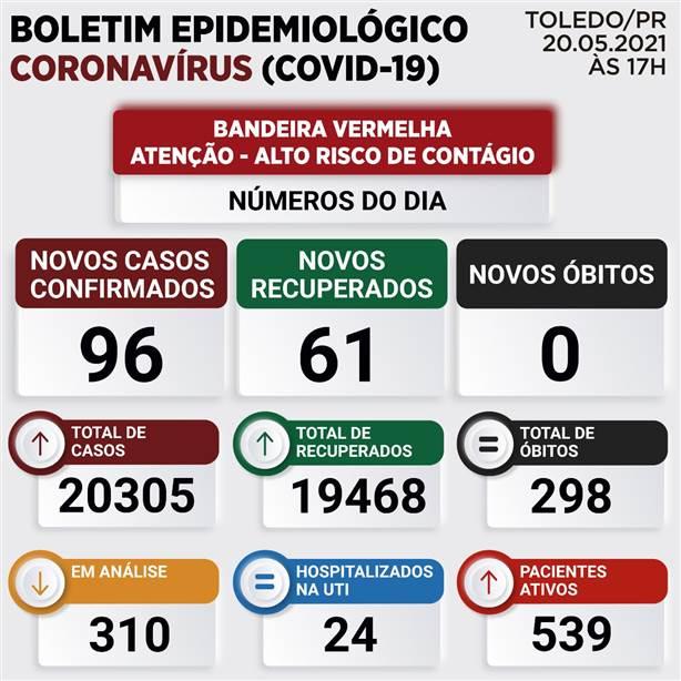 Nesta quinta-feira, dia 20, tivemos a confirmação de 96 novos casos da COVID-19, em Toledo.