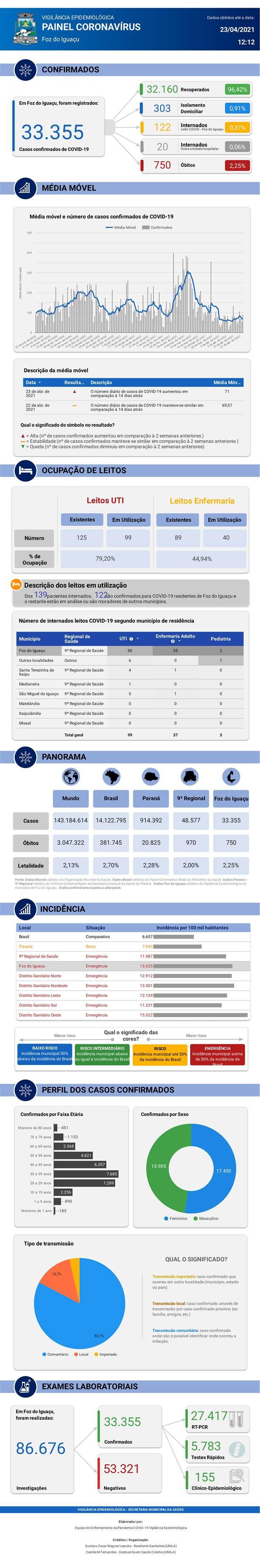 A Vigilância Epidemiológica de Foz do Iguaçu confirma na data de hoje, 23/04/2021, 91 casos de covid-19. No total, são 33.355 casos da doença no município desde o início da pandemia. Destes, 32.160 pessoas já estão recuperadas.
