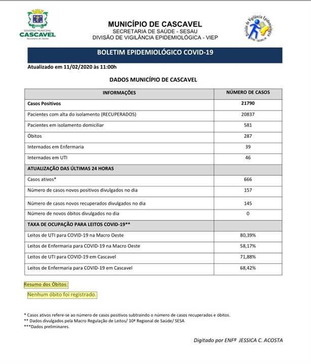 Nesta quarta-feira (10), a Secretaria de Saúde confirmou 21.790 casos de Covid-19 em Cascavel. Dos casos positivos, 20.837 pessoas estão recuperados.