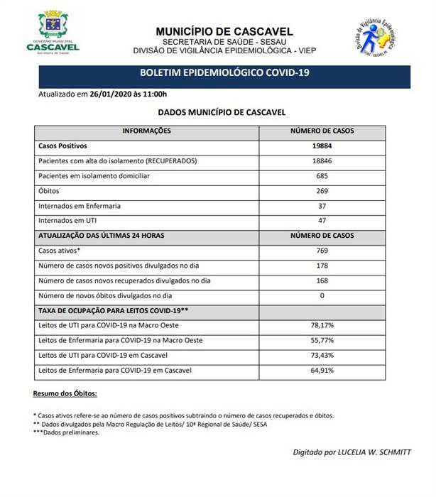 Nesta terça-feira (26), a Secretaria de Saúde confirmou 19.884 casos de Covid-19 em Cascavel. Dos casos positivos, 18.846 pessoas estão recuperadas.