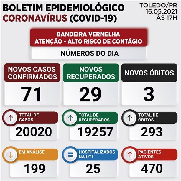 Neste domingo, dia 16/05/2021, tivemos a confirmação de 71 novos casos da COVID-19, em Toledo.