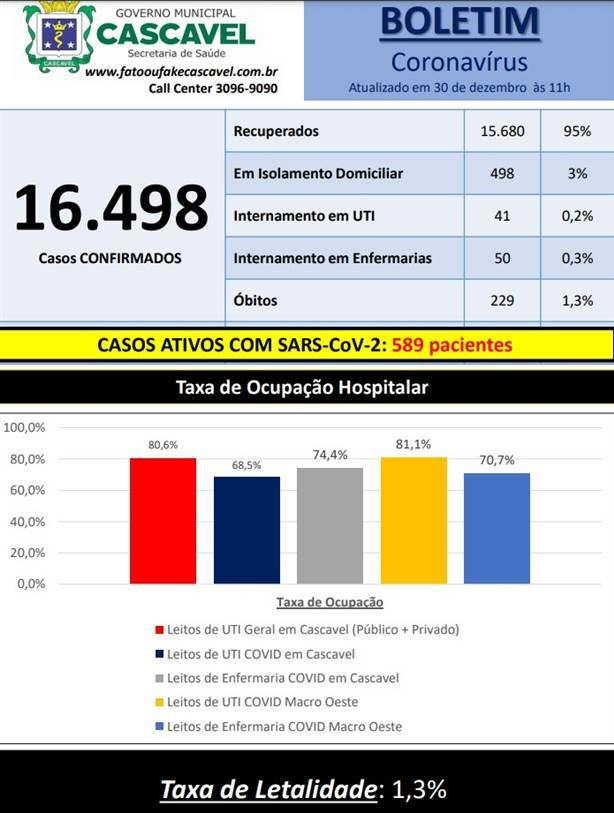 Nesta quarta-feira (30), a Secretaria de Saúde confirmou 16.498 casos de Covid-19 em Cascavel. Dos casos positivos, 15.680 pessoas estão recuperadas. Até o momento, 498 óbitos foram confirmados por conta do novo coronavírus no município.
