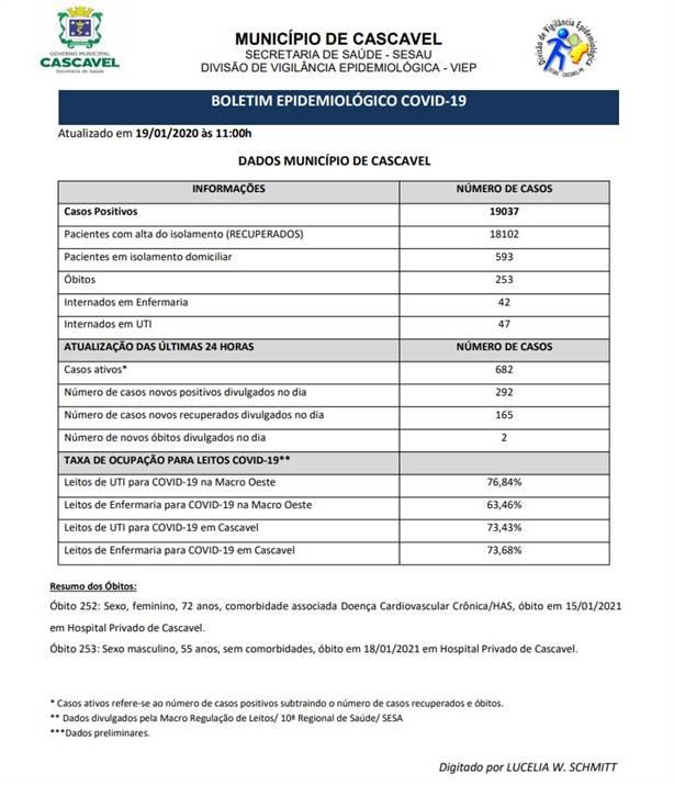 Nesta terça-feira (19), a Secretaria de Saúde confirmou 19.037 casos de Covid-19 em Cascavel. Dos casos positivos, 18.102 pessoas estão recuperadas.