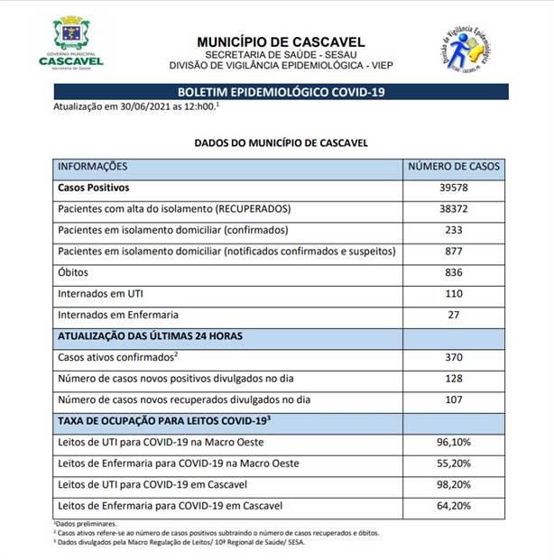 A Prefeitura de Cascavel divulgou nesta quarta-feira (30), o boletim de casos de coronavírus na cidade. Cascavel tem ao todo 39.578 casos positivos, sendo que 38.372pessoas já se recuperaram da doença. Atualmente 877 pessoas encontram-se em isolamento domiciliar com casos confirmados e suspeitos.