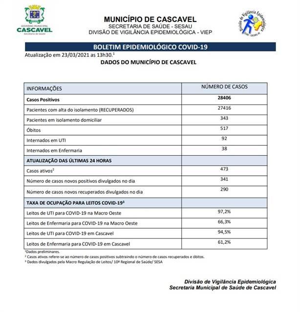 Nesta terça-feira (23), a Secretaria de Saúde de Cascavel, divulgou o boletim atualizando os casos de Coronavírus em Cascavel. No momento são 28.406 casos positivos. Desses, 27.416 estão recuperados. Na cidade 343 pessoas estão em isolamento domiciliar.
