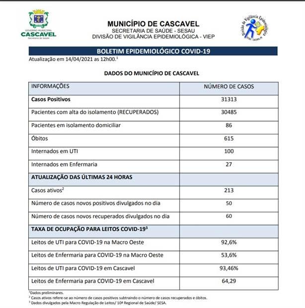 Nesta quarta-feira (14), a Secretaria de Saúde de Cascavel divulgou o boletim atualizando os casos de Coronavírus no município. No momento são 31.313 casos positivos, 30.485 pessoas se recuperaram da doença na cidade. Outras 86 pessoas estão em isolamento domiciliar.