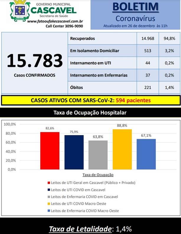 Neste sábado (26), a Secretaria de Saúde confirmou 15.783 casos de Covid-19 em Cascavel. Dos casos positivos, 14.968 pessoas estão recuperadas. Até o momento, 221 óbitos foram confirmados por conta do novo coronavírus no município.