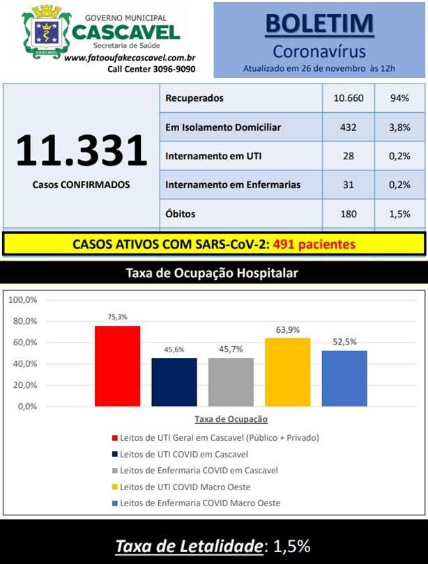 Nesta quinta-feira (26), a Secretaria de Saúde confirmou 161 novos casos de Covid-19 em Cascavel. A cidade chega totalizando 11.331 testes positivos da doença. Além disso, 10.660 pessoas estão recuperadas da doença. Até o momento, 180 óbitos foram confirmadas por conta do novo coronavírus no município.