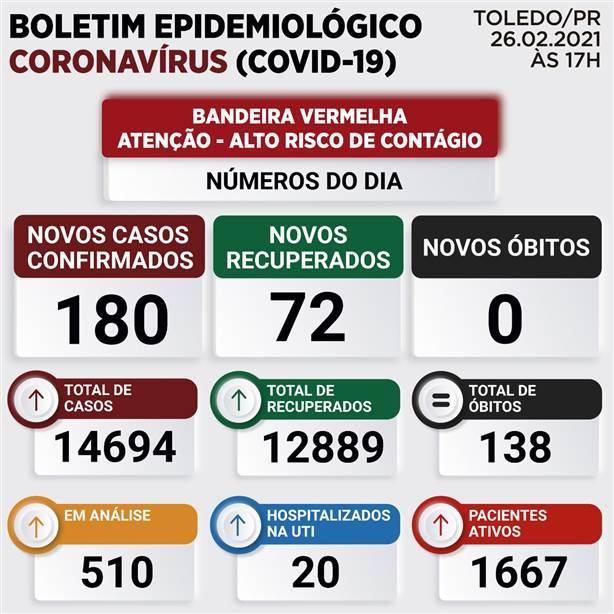Nesta sexta-feira, dia 26/02/2021, tivemos a confirmação de 180 novos casos da COVID-19, em Toledo