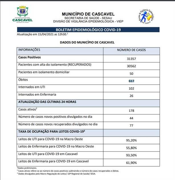 No total 617 pessoas já morreram com Covid-19 em Cascavel.