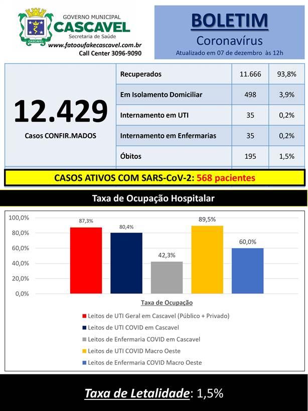 Nesta segunda-feira (07), a Secretaria de Saúde confirmou 170 novos casos de Covid-19 em Cascavel. A cidade totaliza 12.429 testes positivos da doença. Além disso, 11.666 pessoas estão recuperadas. Até o momento, 193 óbitos foram confirmados por conta do novo coronavírus no município.