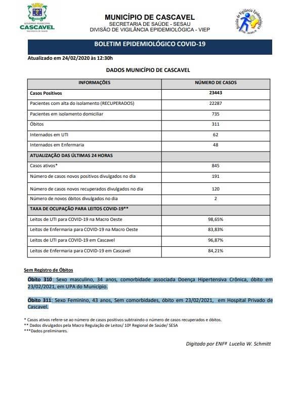 Óbito 310: Sexo masculino, 34 anos, comorbidade associada Doença Hipertensiva Crônica, óbito em 23/02/2021, em UPA do Município. Óbito 311: Sexo Feminino, 43 anos, Sem comorbidades, óbito em 23/02/2021, em Hospital Privado de Cascavel.